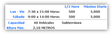 - Los valores para cada usuario tienen un valor de $500 cada ½ Hora, máximo diario $8.000, pudiendo estacionar por Avenida Presidente Riesco 5330. Los estacionamientos tienen una capacidad de 700 vehículos en 3 niveles, funcionamiento de lunes a domingo.